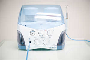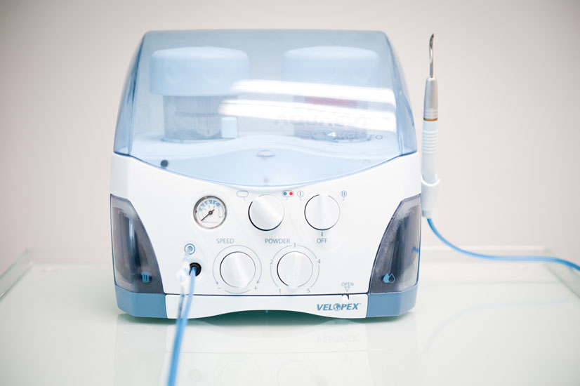 piaskarka abrazyjna Aquacut Quattro 4 - służy do wykonywania zabiegów zarówno profilaktycznych, polegających na usuwaniu osadu nazębnego i przebarwień szkliwa (piaskowanie), jak też do opracowywania ubytków próchnicowych zastępując wiertło.